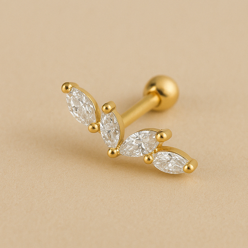 Avec ses cinq strass taillés en marquise, ce piercing évoque la légèreté d’une aile ou la finesse d’une feuille délicate. Son design aérien, en acier inoxydable 316L, capte la lumière sous tous les angles et apporte une touche élégante et raffinée à l’oreille.