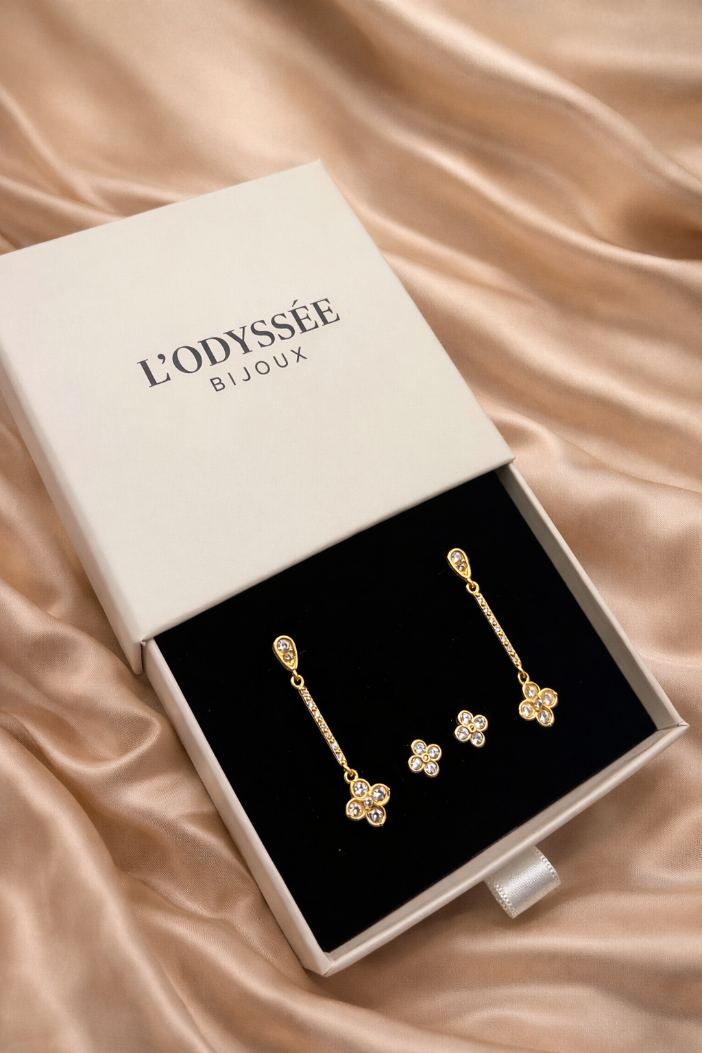 Les grandes boucles Élansia déploient leur éclat floral dans un mouvement aérien, tandis que les piercings Florisia viennent ponctuer l’ensemble de touches lumineuses, comme de petites constellations.