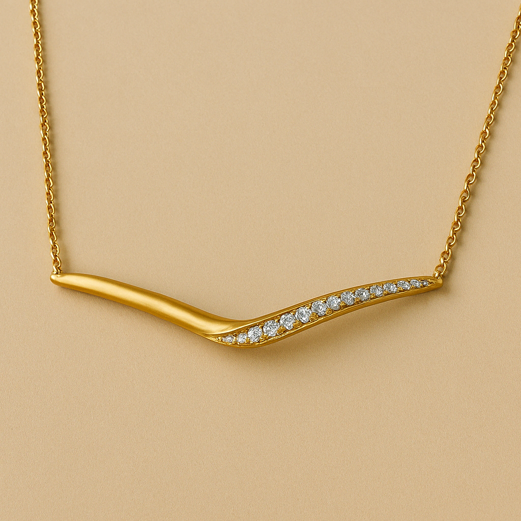 Élégant et contemporain, ce collier présente une ligne fluide légèrement incurvée, parsemée de strass scintillants qui captent la lumière avec subtilité. Réalisé en acier inoxydable 316L, il allie modernité et raffinement dans un design épuré.